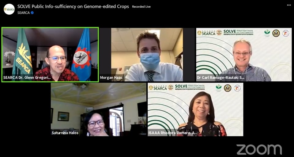 SEARCA teamed up with the USDA Foreign Agricultural Service, United States Embassy Manila, and the International Service for the Acquisition of Agri-biotech Applications (ISAAA) for the 35th SEARCA Online Learning and Virtual Engagement (SOLVE) webinar entitled “SOLVE Public Info-sufficiency on Genome-edited Crops” held on 8 September 2021 via Zoom and Facebook. The webinar is part of the annual Biotech Outreach Program, which aims to provide a venue for knowledge sharing and learning with different stakeholders and contribute to improved understanding and acceptance of biotechnology in the country, with focus on genome editing technologies in crops.