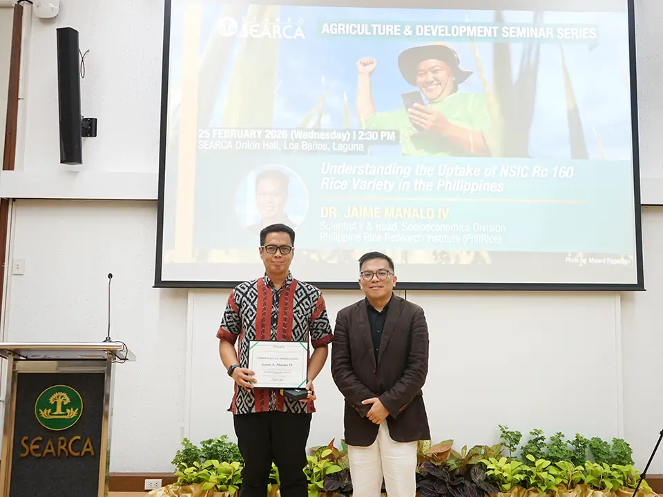 LOS BAÑOS, Philippines—The uptake of any rice variety, from farm to table, is a complex process shaped by the divergent priorities of multiple stakeholders. Presenting his team's study "Understanding the Uptake of NSIC Rc 160 Rice Variety in the Philippines" at the SEARCA Agriculture and Development Seminar Series (ADSS) held on 25 February 2026 at the Southeast Asian Regional Center for Graduate Study and Research in Agriculture (SEARCA) and livestreamed via Facebook, Dr. Jaime Manalo IV of the Philippine Rice Research Institute (PhilRice) underscored how divided priorities along the rice chain have slowed the progress of Rc 160. The variety is noted by some millers as holding export potential if stable volume and quality can be ensured. The research is published in the December 2025 issue of the Asian Journal of Agriculture and Development (AJAD), SEARCA's international scientific journal.