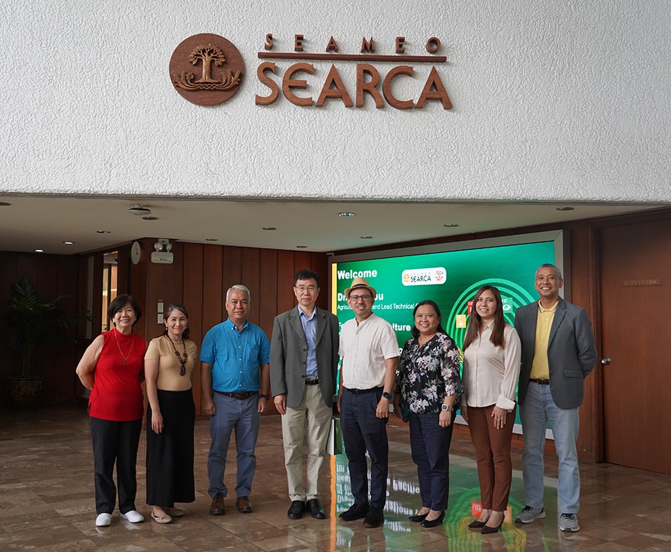 Dr. Bo Zhou, agriculture officer and lead technical officer of the Food and Agriculture Organization of the United Nations-Regional Office for Asia and the Pacific (FAO RAP), paid a visit to the Southeast Asian Regional Center for Graduate Study and Research in Agriculture (SEARCA) on 11 August 2023 to revisit past partnerships and explore new areas of collaboration. He was accompanied by Dr. Romeo Labios, agronomist and farming systems specialist, FAO RAP.