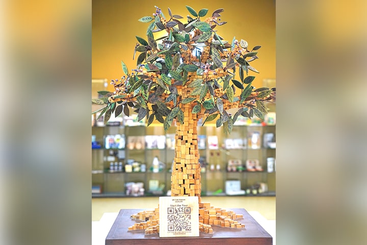 Inspect this work of art inspired by the molave tree in the SEARCA logo and crafted from thousands of pieces of engineered bamboo elements, scrap mahogany wood, wastepaper, and recycled metals to symbolize sustainable development.
